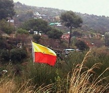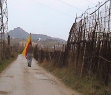El personaje que traslada la bandera deambula por espacios subalternos, zonas en el linde de la ciudad, huertos suburbanos, espacios residuales en definitiva. Al buscar algún sitio donde abandonar su carga simbólica deviene un flaneur de los lugares subsidiarios.